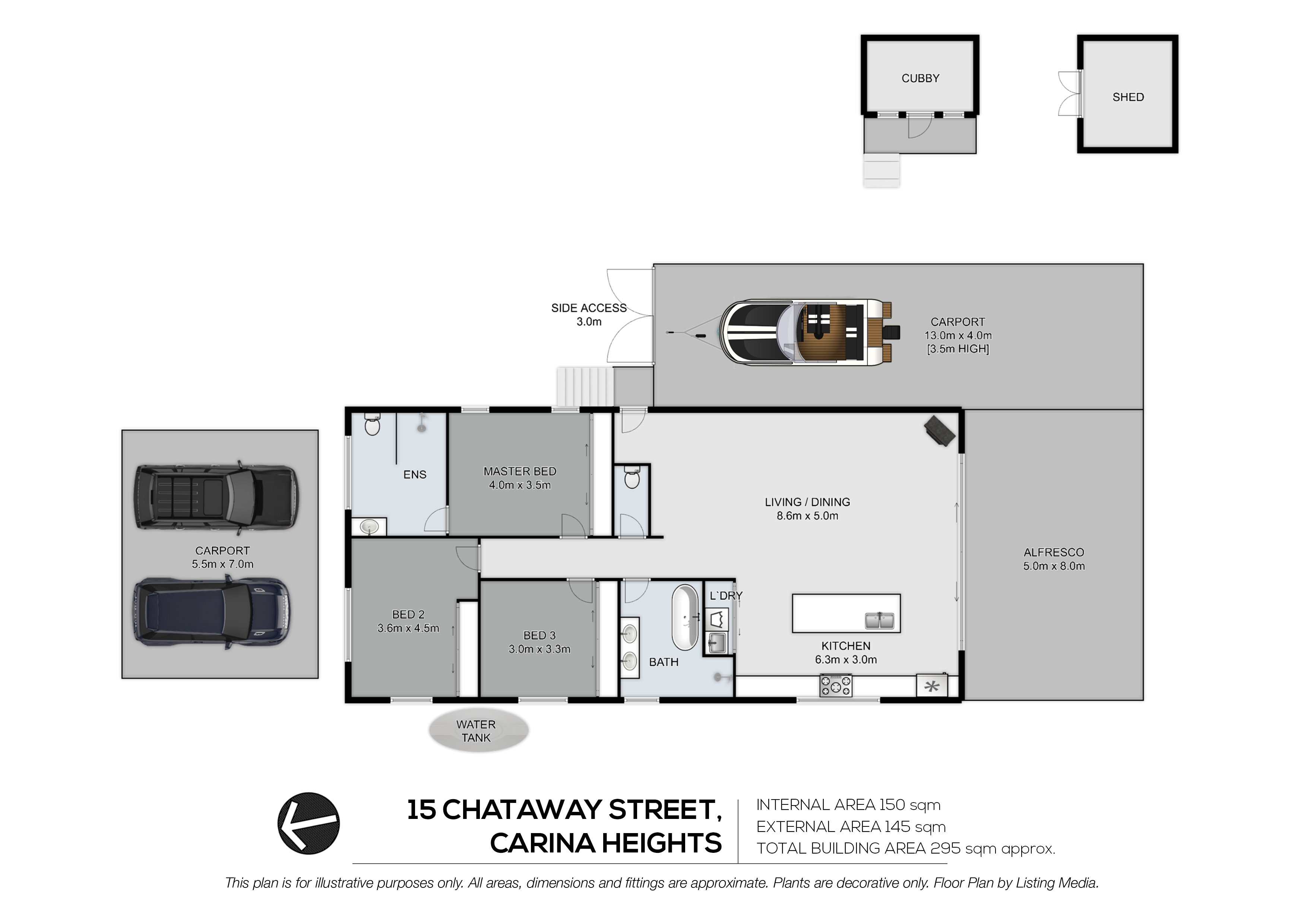 - Double carport plus additional gated parking for two extra cars, a boat, caravan or trailer