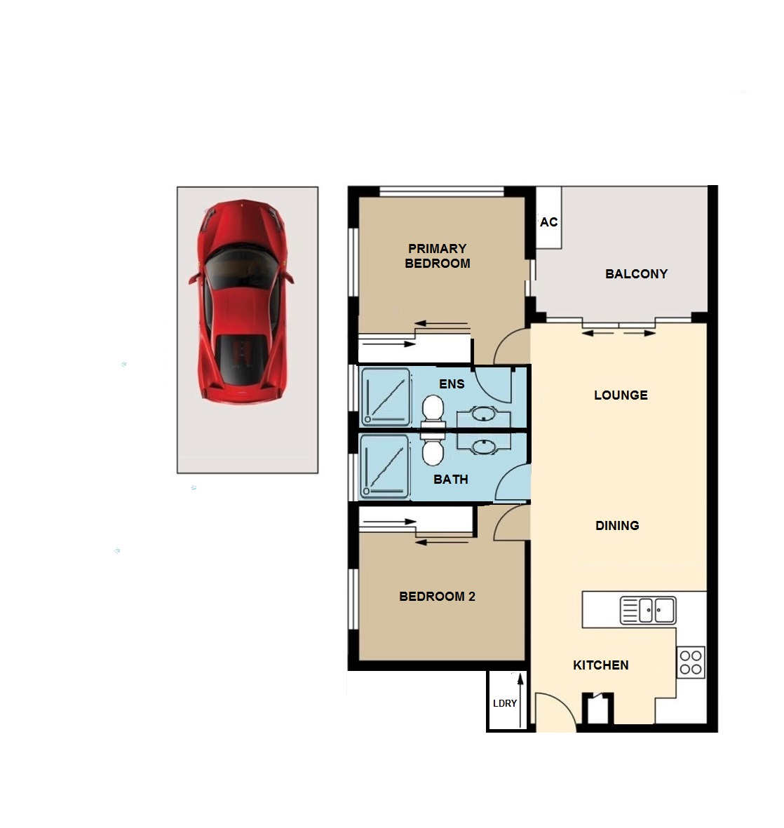 Both bedrooms offer built-in wardrobes with easy access to nearby bathrooms. With separate laundry facilities and storage cupboard, this unique design is ideal for a professional couple or those who may like to work from home.