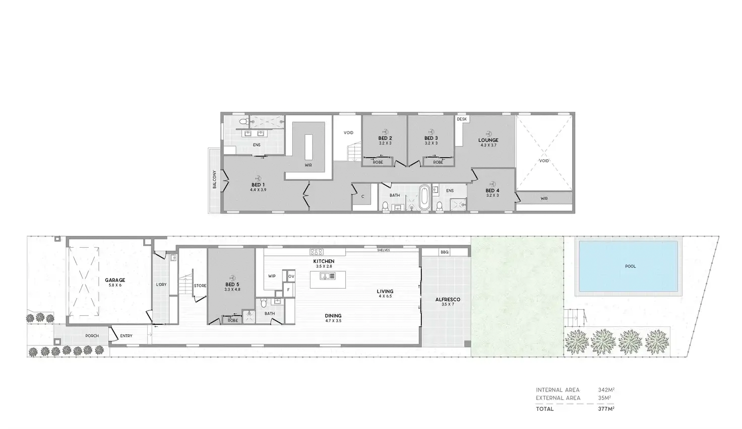 Inspired by timeless Hamptons style with resort-inspired elements, the home unfolds across a flowing layout that seamlessly blends indoor and outdoor living. Herringbone oak floors, stone finishes, wall panelling and brushed brass accents complement a soft, contemporary palette beneath 2.7-metre ceilings and a striking 5.5-metre void, creating an immediate sense of space and sophistication.