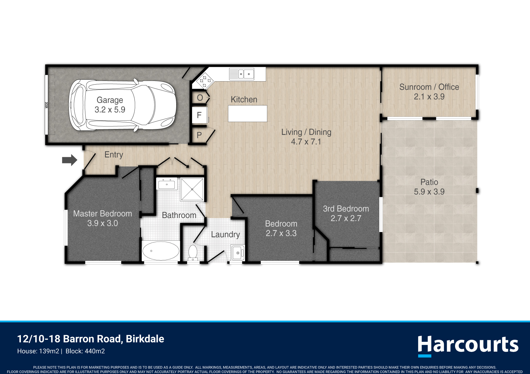 The villa offers an air-conditioned open plan living/dining spaces that look out to a private outdoor entertaining area and large backyard, a well-appointed kitchen with ample storage & island bench, three bedrooms (with built in wardrobes), sunroom/office, two-way bathroom and a single lock-up garage with internal access and remote door
