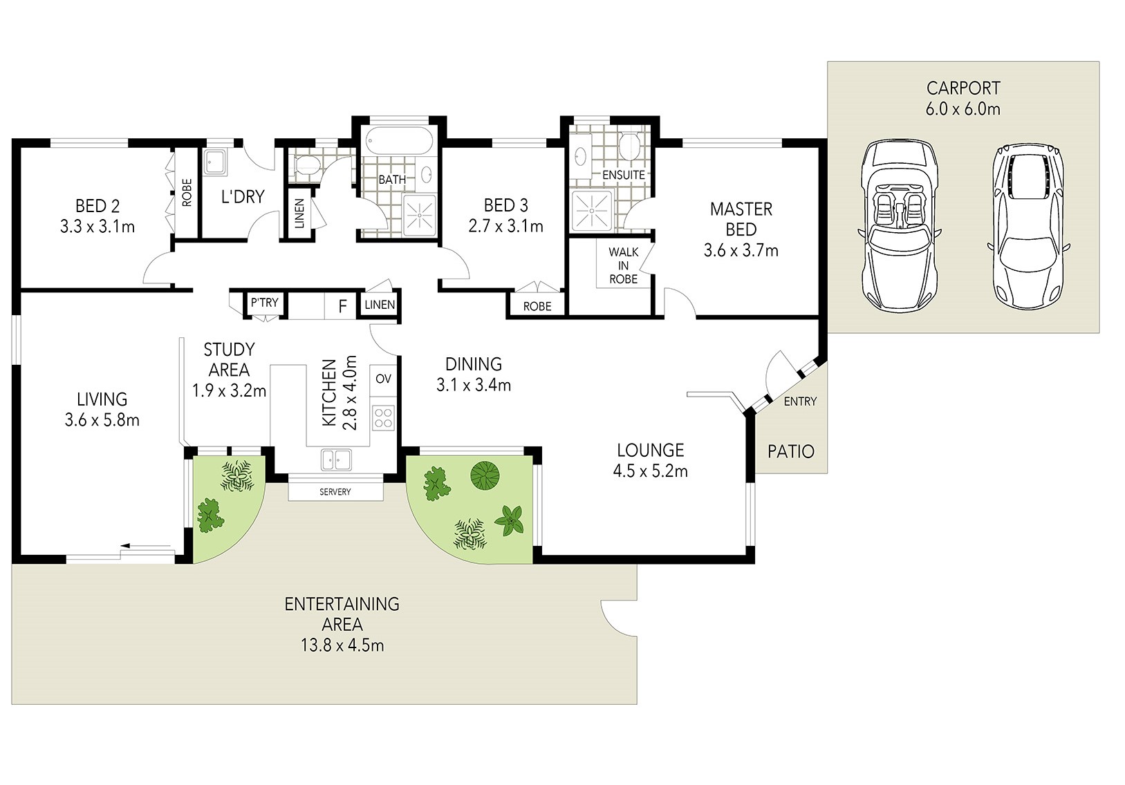 Each of the three bedrooms have built-in wardrobes with the master including a walk-in. There is a private ensuite in the master with a family-appointed bathroom including a separate bath; both wet rooms in great condition whilst also offering opportunity to add value when desired. Additional features include a separate laundry and double carport.