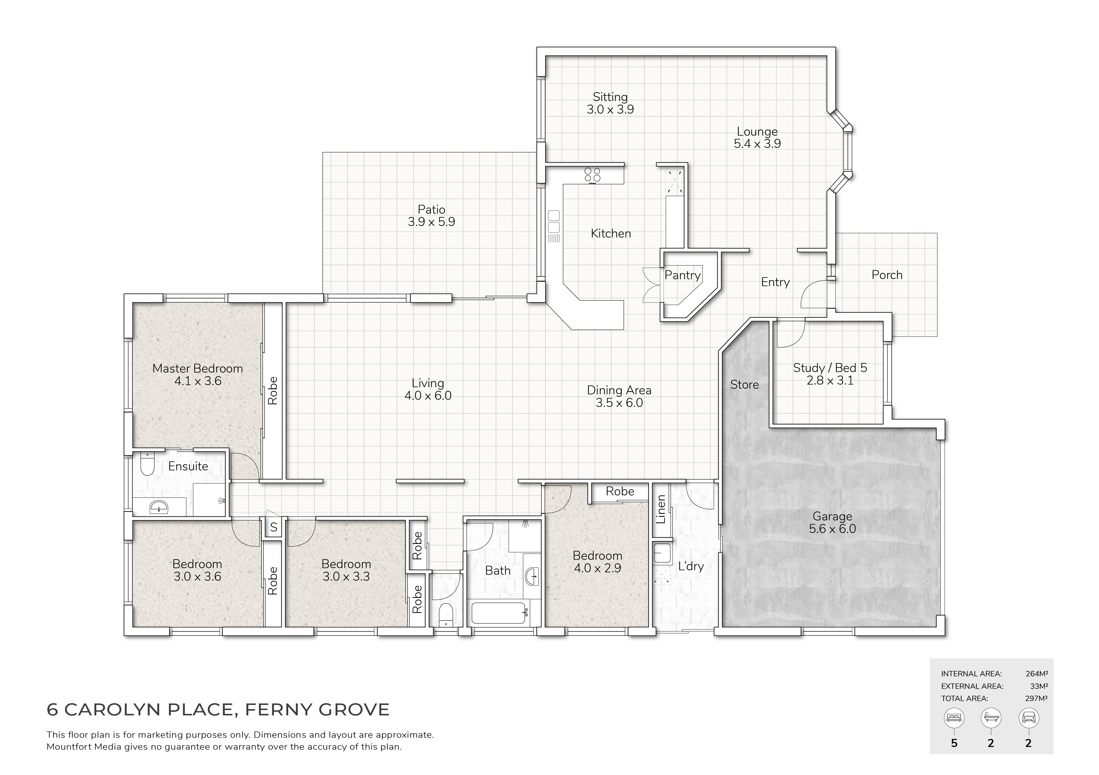 Generously scaled and versatile in layout, there are good options for families to embrace connection or have separation as desired. A large lounge and sitting room are comfortably carpeted with spacious dining and living sitting on low-maintenance tiles; ducted air-conditioning flowing throughout. Anchoring the zones with a flowing layout, the kitchen provides excellent storage over a spacious footprint, complimented by stainless appliances, expansive bench space and breakfast bar seating.