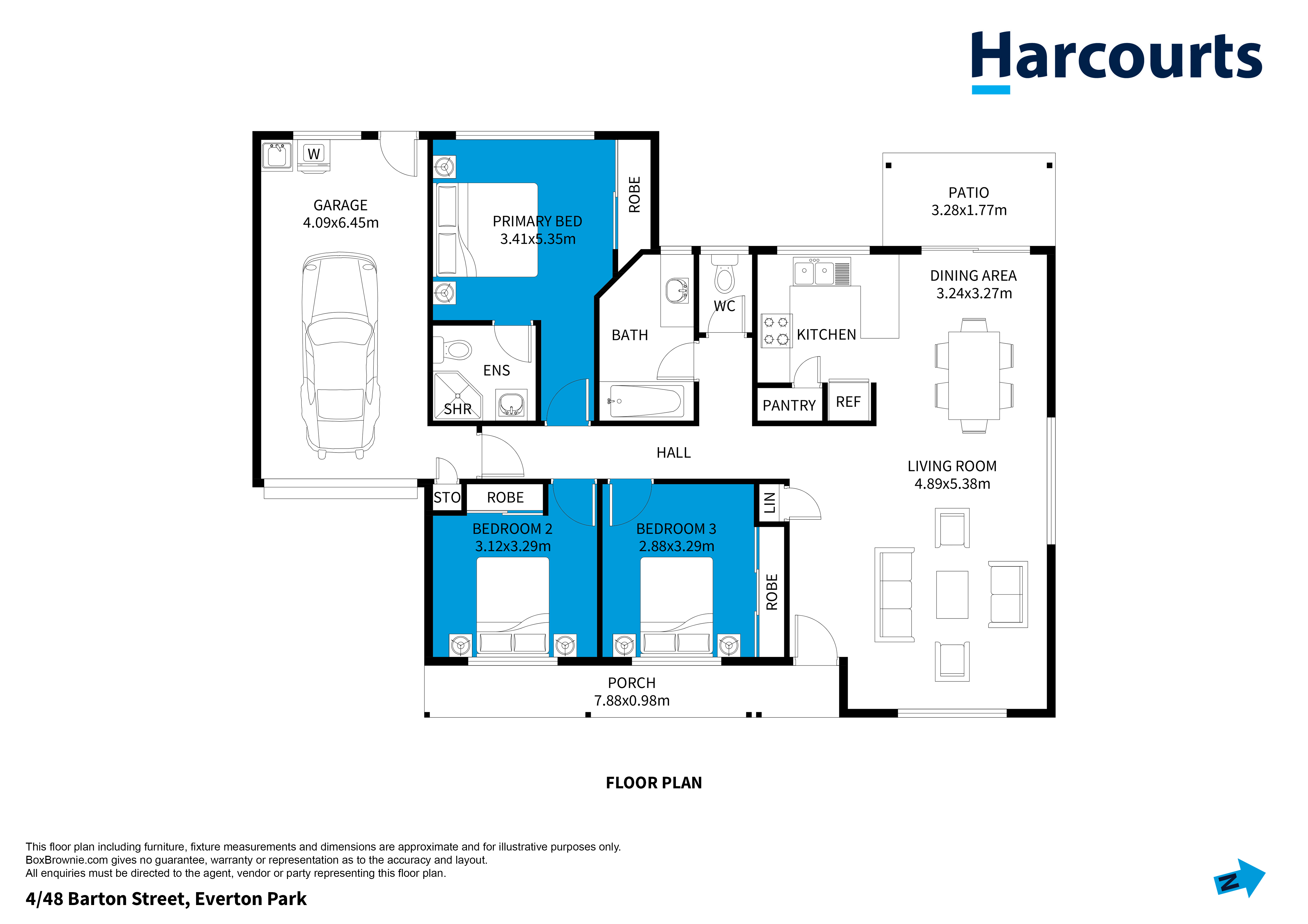 The bedrooms are large and well-positioned to the bathroom for easy access. The lounge is big enough for a couch and two armchairs. The dining room is big enough for a 6 seater.