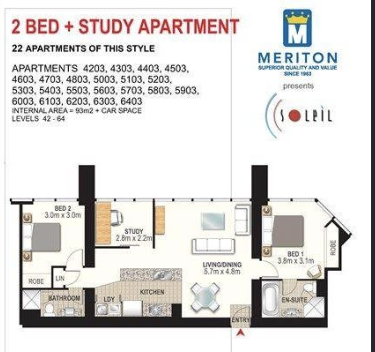 We are proud to introduce a rare opportunity to purchase a 2 Bedroom PLUS Study apartment in the building Meriton Soleil! Located on level 53, this high-rise property boasts breathtaking views as far as the eye can see. This light filled apartment features floor to ceiling windows throughout, ensuring that the views are captured in every bedroom, and living room - you won't want to miss out on this!