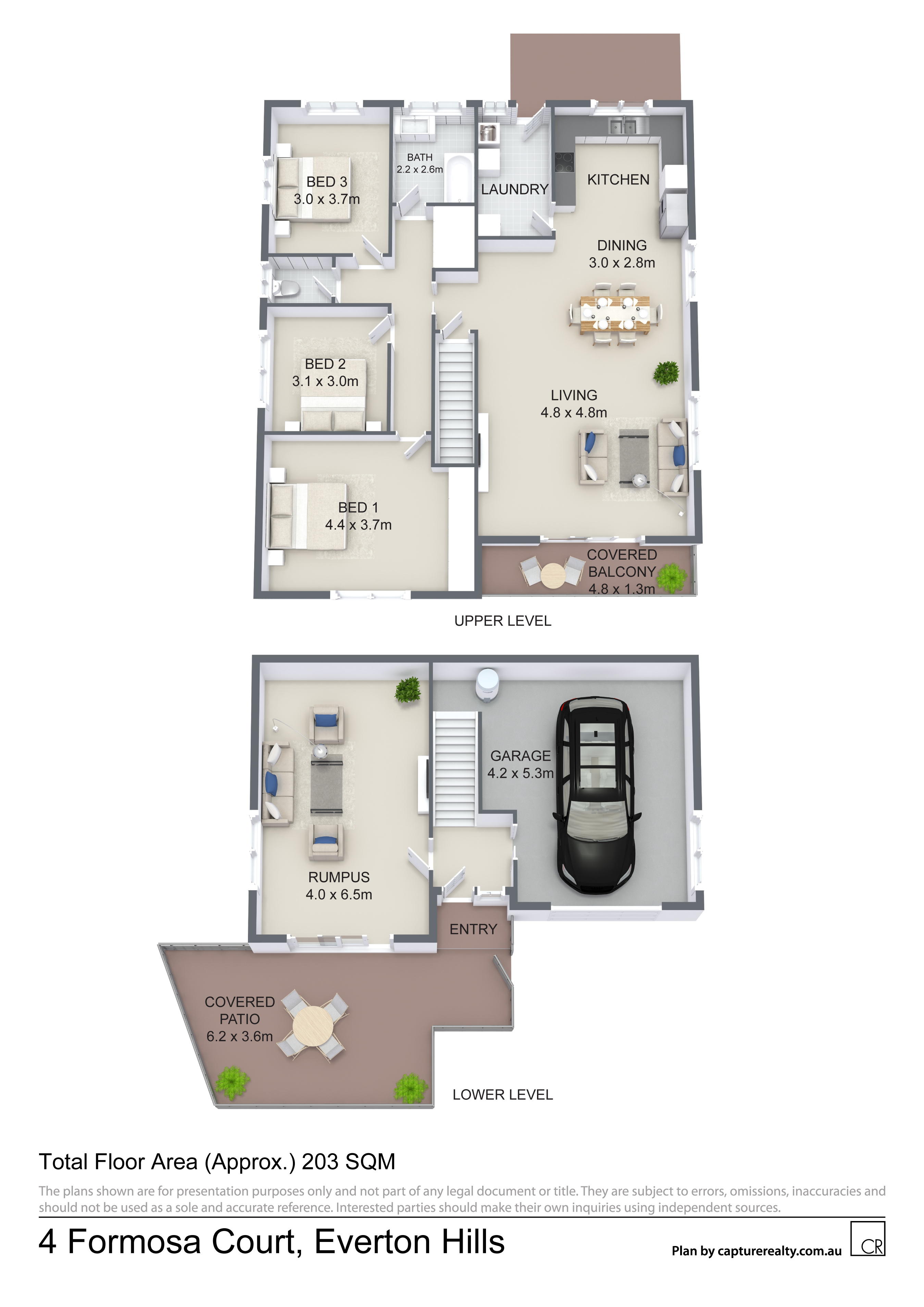Internal stairs leads down to the tiled entry with internal access to a roomy rumpus space opening to private covered outdoor entertaining; an ideal space for both little & big kids (Man cave!). There's also internal access to the lock up garage with good storage.